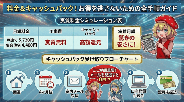 A: はい、手続きを正しく行えば確実にもらえます。ただし、開通から4ヶ月後に届くメールを見逃したり、手続き期限(1ヶ月間)を過ぎると受取権利が消滅します。スマホのリマインダー設定を強く推奨します。