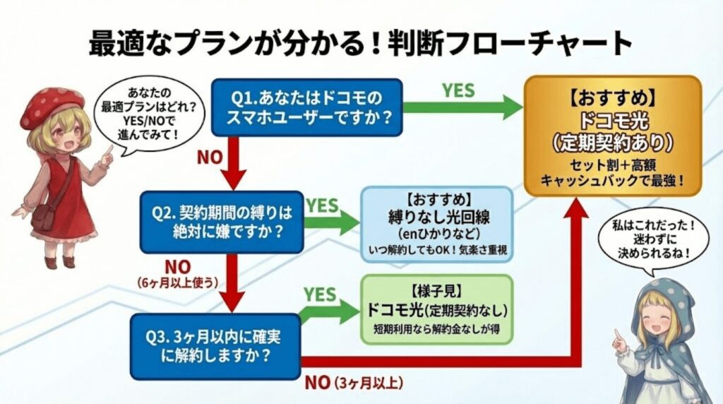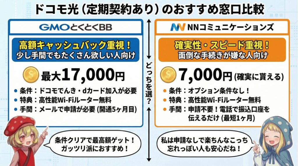 ほとんどの人にとって、定期契約ありプランが最適な選択です。ドコモユーザーなら、今すぐGMOとくとくBBまたはNNコミュニケーションズから申し込んで、お得にドコモ光を始めましょう!