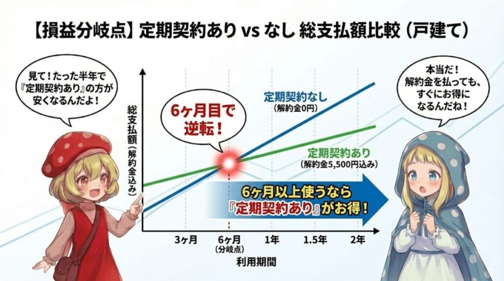 - 6ヶ月以上使うなら定期契約ありが得:解約金を払っても、半年以上使えば定期契約ありの方が安い