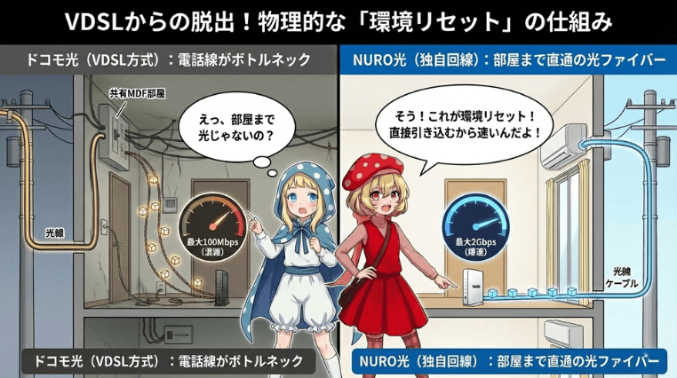 VDSL方式では、建物の共用部までは光ファイバーで来ていても、そこから各部屋までは「電話回線(メタルケーブル)」を使うため、どうしても速度が100Mbps程度に制限されます。これはドコモ光の問題ではなく、建物の配線設備の限界です。