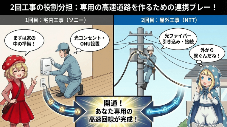 NURO光の開通工事は、宅内工事と屋外工事の2回に分かれています。これはNURO光が独自回線を使用しているため、他社とは異なる手順が必要になるからです。