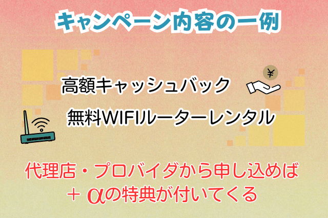 それぞれの窓口で提供されるキャンペーン内容が異なり、特に代理店経由の場合は高額な現金キャッシュバックを受け取れるケースが多くなっています。