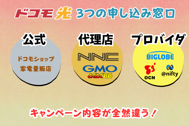 ドコモ光への乗り換えキャンペーンは、申込窓口によって特典内容が大きく異なります。同じドコモ光のサービスを契約するのに、窓口を変えるだけで受け取れる金額が数万円も変わってくるのです。