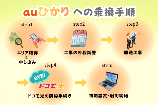 ドコモ光は光コラボレーション(フレッツ光回線を使用)ですが、auひかりはKDDI独自回線のため、事業者変更の仕組みが使えません。そのため、以下の手順が必要になります。