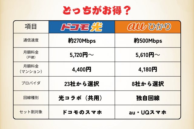 ドコモ光とauひかりの比較!料金・速度・プロバイダの違い