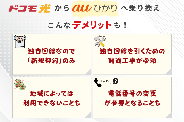 ドコモ光からauひかりへの乗り換えは「事業者変更」ではなく、「解約+新規契約」の手続きが必要です。