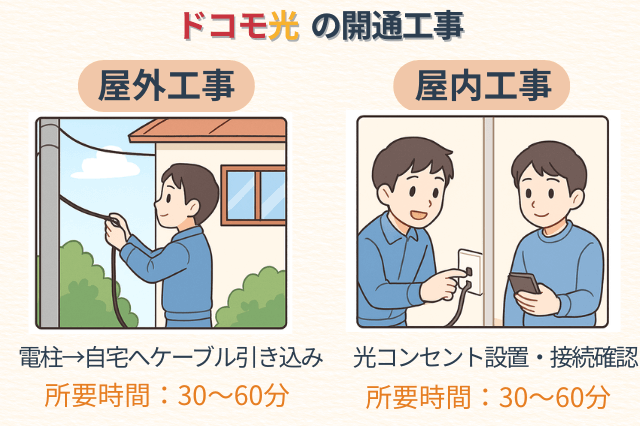 ドコモ光の開通工事は屋外工事と屋内工事の2つに分かれています。