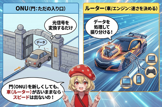 ONUは光信号をデジタル信号に変換する「門」のような存在です。一方、実際に通信を処理して各デバイスに振り分けているのはルーター(車のエンジン)です。