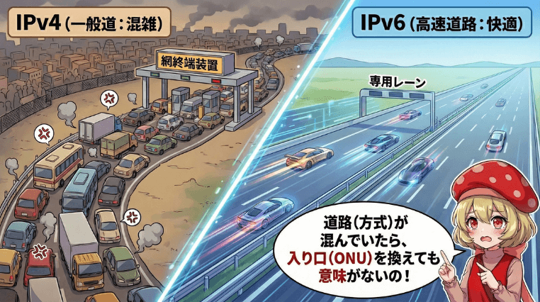 - IPv4(旧道路):夜間や休日に大渋滞。どんなに車が新しくても遅い