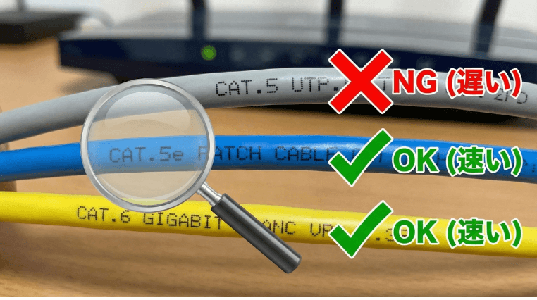 ケーブルに「CAT5e」「CAT6」などの表示があるか確認してみましょう。もし「CAT5」だけの表示なら、ケーブルを交換するだけで速度が改善する可能性があります。