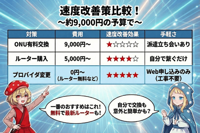 ただし、速度低下の原因がONUにない場合、交換しても1ミリも速度は改善しません。むしろ、有料でONU交換に8,000円〜1万円を払うなら、その予算でもっと効果的な改善方法があります。